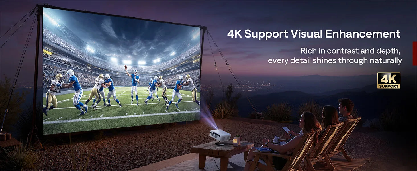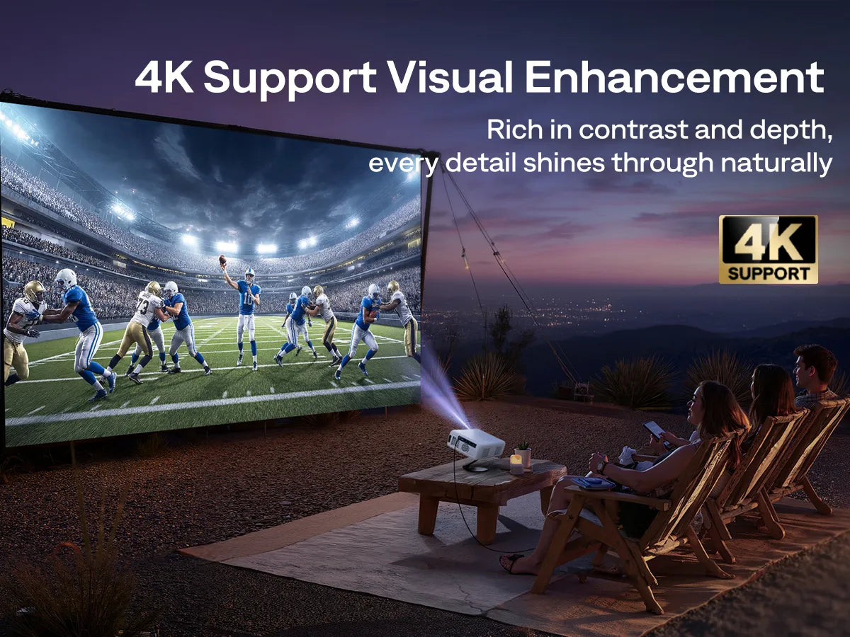 Equipped with 1 HDMI port, 2 USB ports, and a 3.5mm headphone jack, it seamlessly connects to TV sticks, laptops, iPhones, Android devices, iPads, USB drives, gaming consoles like Switch and PS5, and more. Designed for both indoor and outdoor use, it’s the perfect companion for movies, gaming, small meetings, camping, parties, studying, and business presentations.
