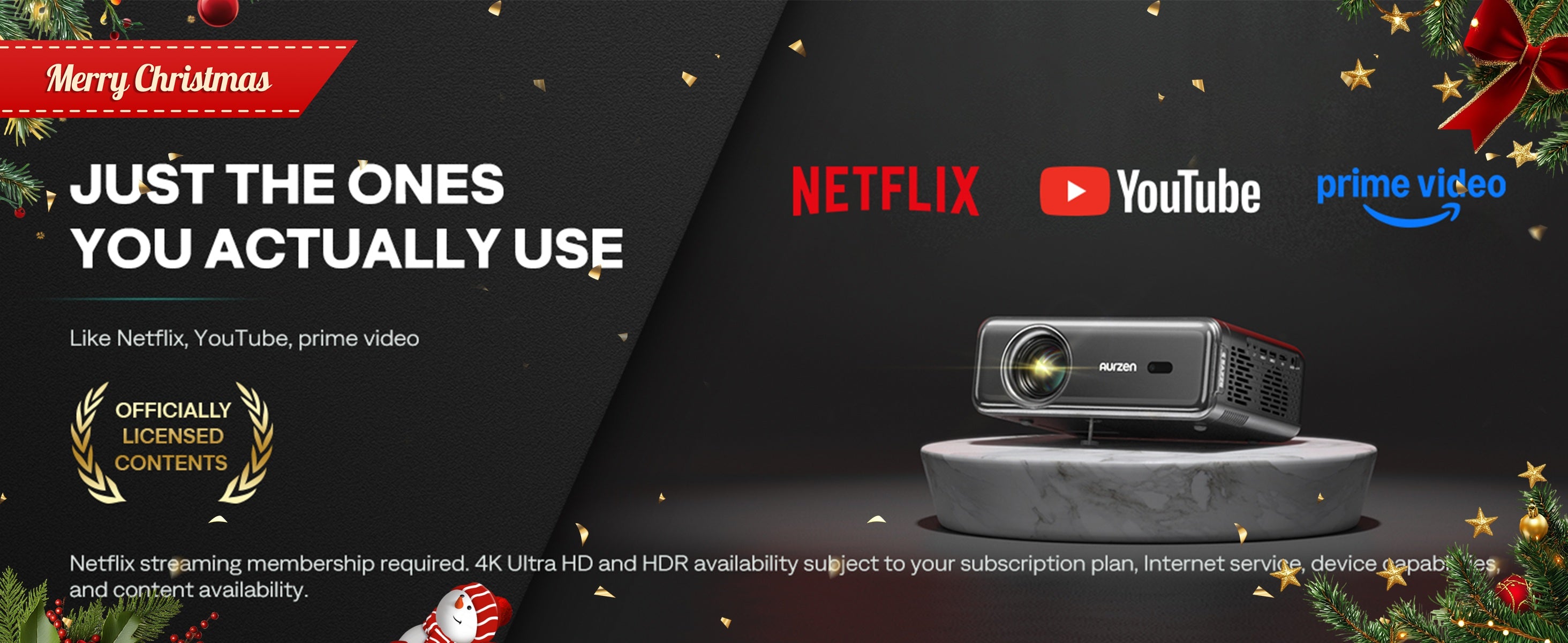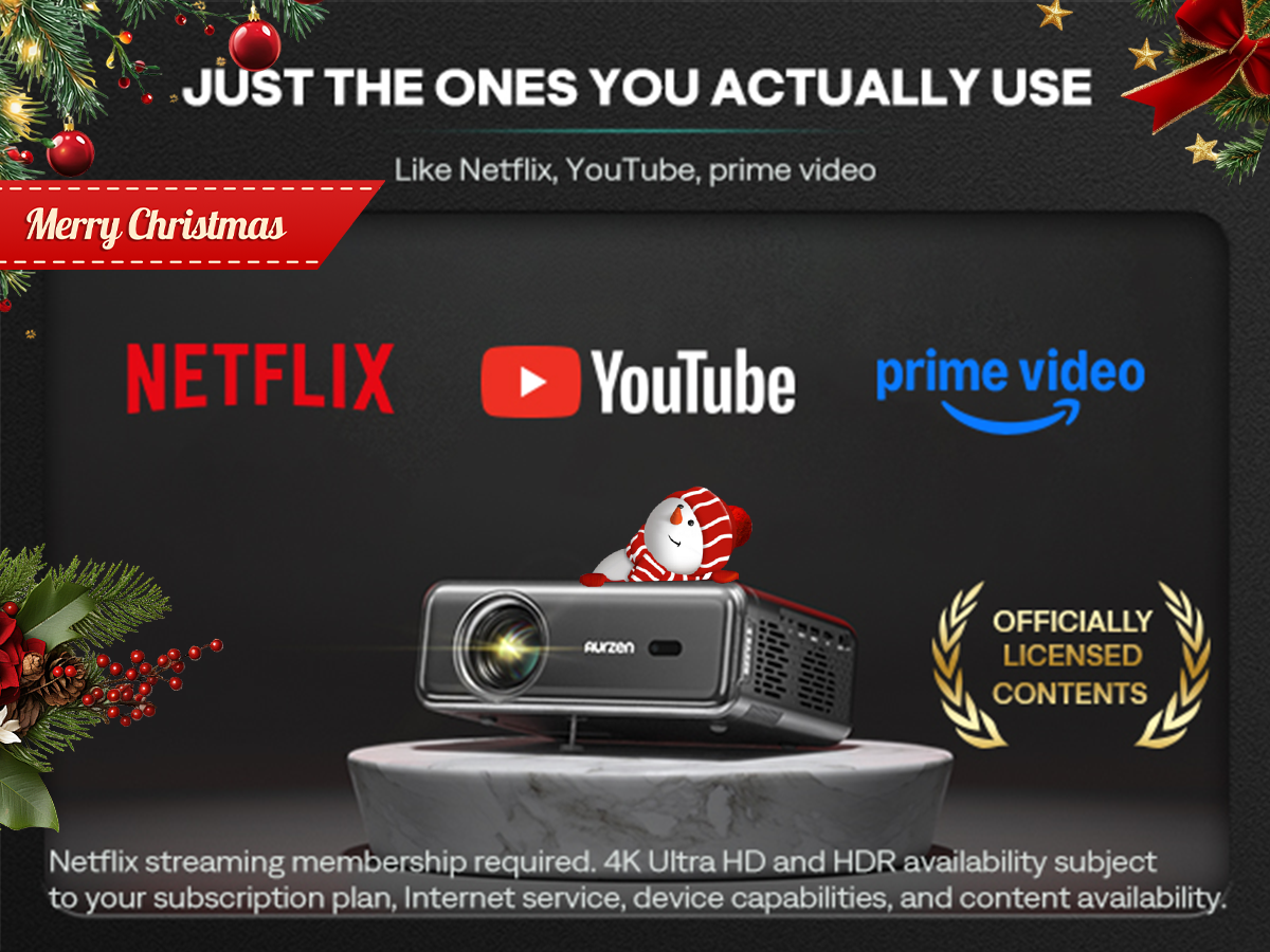 The Aurzen EAZZE D1 Pro TV projector works seamlessly with officially licensed Netflix, Prime Video, and YouTube, along with over 100 additional apps available for download, allowing you to stream your favorite shows and movies with ease. With just one click, enjoy unlimited movies, shows, and more without needing an additional TV stick. For apps not found in the store, the built-in Open Browser allows you to access the internet directly from the projector, ensuring you can always explore and enjoy your favorite content online.