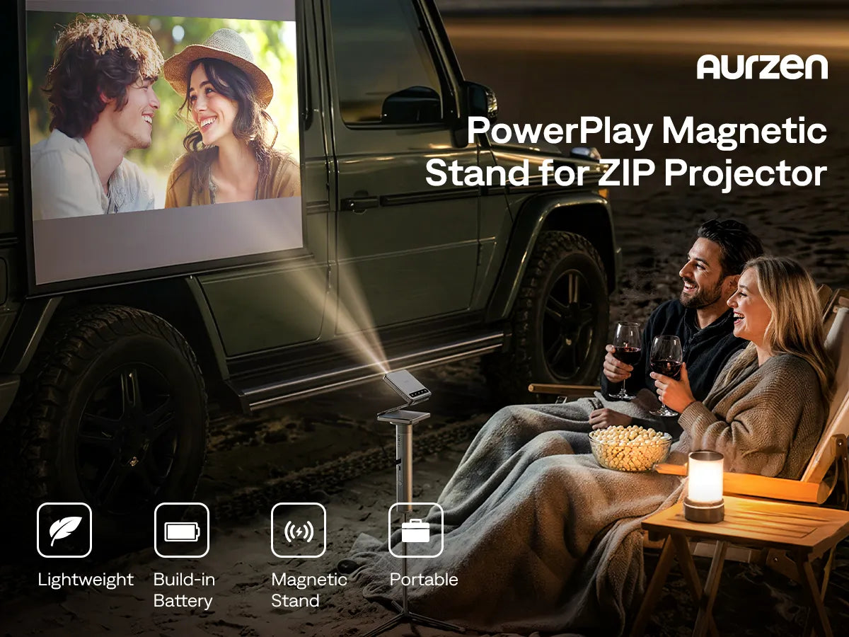 Aurzen PowerPlay 3-in-1 Projector Stand is designed to perfectly complement the Aurzen ZIP Projector, extending playtime from 1.5 to 3 hours with its built-in 10000mAh power bank. This all-in-one kit combines a magnetic stand, portable power source, and compact carrying case for effortless mobility and creativity anywhere. Weighing only 470g, it assembles in seconds and adjusts to three customizable heights (23 cm, 33 cm, 43 cm) for any setup. With its universal 1/4-inch screw adapter, PowerPlay also supports cameras, smartphones, and lighting gear—making it the ultimate companion for entertainment, art, and on-the-go creation.