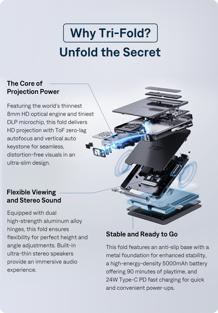 This design enables height adjustments and allows projection angles from 0° to 90°, supporting a wide range of scenarios—from projecting onto the ceiling to the floor—without any accessory. Applying advanced materials and optimizing the structure, ZIP achieves the perfect balance of tri-fold functionality, portability, HD projection, and stand-free operation.