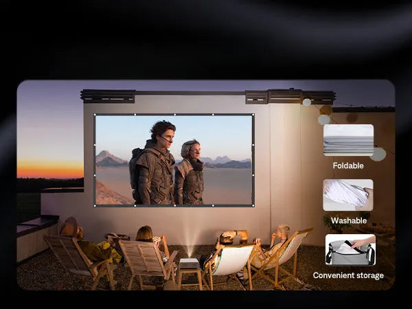 120 Zoll ist genau die richtige Größe für den Innen- und Außenbereich, z. B. für Heimkino, Bildung, Präsentationen, Vorlesungen, Büro, Klassenzimmer oder Spiele usw.; und auch für den Außenbereich geeignet, z. B. für Gartenpartys, Heiratsanträge, Geburtstagsfeiern usw. Darüber hinaus kann unsere Heimprojektionsleinwand auch als Geschenk für Familienmitglieder, Freunde und Partner verwendet werden. Es wird eine wunderbare Erfahrung sein, in warmen Nächten mit Familie und Freunden Lieblingsfilme zu genießen