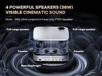 Contrairement aux projecteurs classiques, cet appareil est équipé de deux haut-parleurs visibles de 36 W avec un son stéréo 3D 2.2 canaux. Profitez d'aigus nets, de médiums détaillés et de basses puissantes pour une véritable expérience surround, surpassant même les projecteurs à 1 000 $.