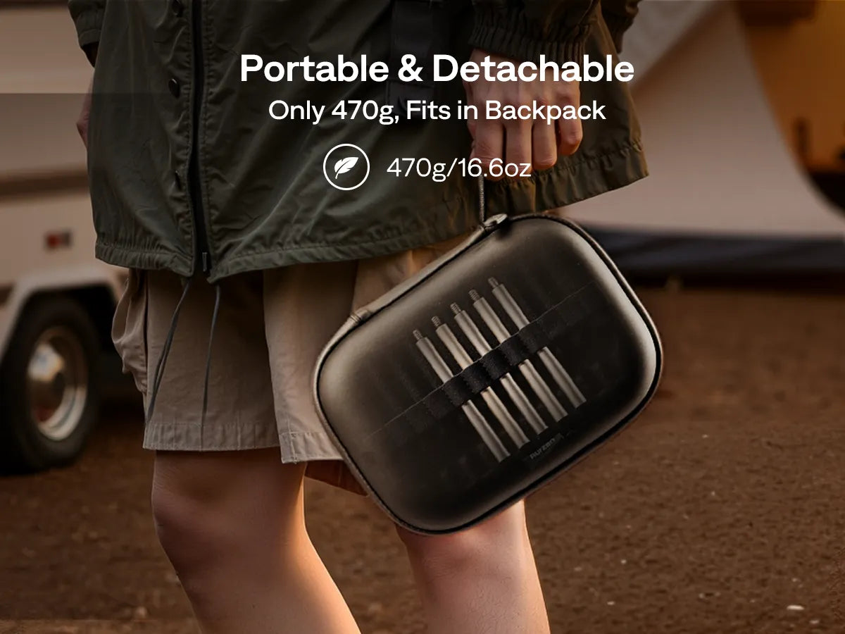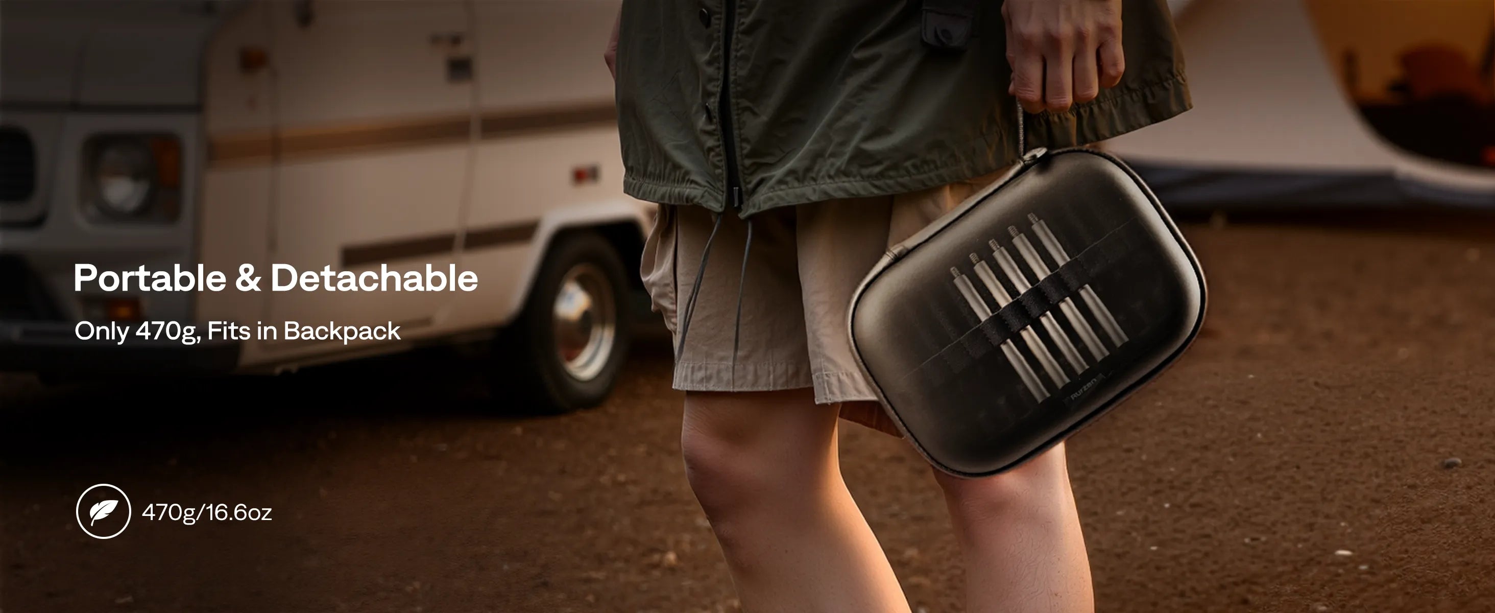 O PowerPlay pesa apenas 470 g e é desmontável em 8 partes compactas. Ele vem com um estojo de transporte, facilitando o transporte na mochila para uso em qualquer lugar.