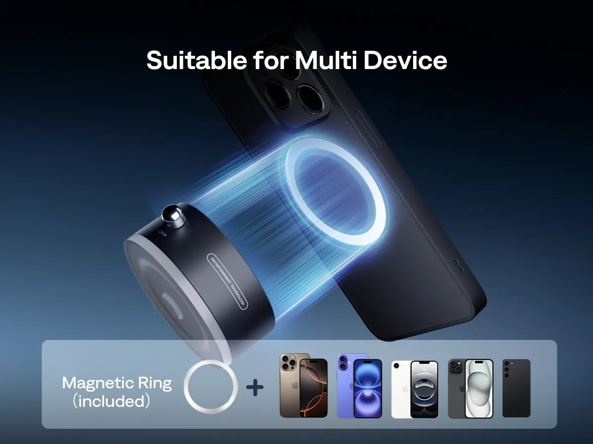 Compatível com projetores ZIP, iPhones MagSafe (séries 12/13/14/15/16) e outros smartphones que utilizam o anel magnético incluso. Encaixe instantâneo, sem necessidade de configuração adicional.